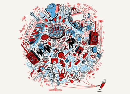 Вот ещё несколько подсказок от редакции The Economist: изображение человеческого мозга с чипами, всевозможные, в том числе четвероногие, роботы, джойстик означают, что «обеспокоенность влиянием ИИ на рабочие места, особенно выпускников вузов, будет усиливаться». А масса, судя по всему, дешёвых (иначе бы ими не разбрасывались) пилюль, пластинка с таблетками и пластиковый флакон с некими препаратами — предвестники новой эпохи.